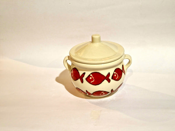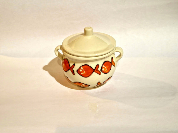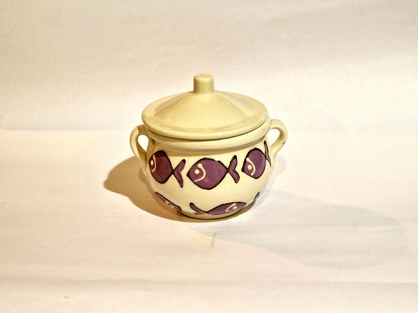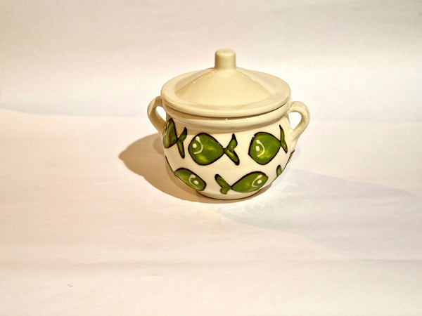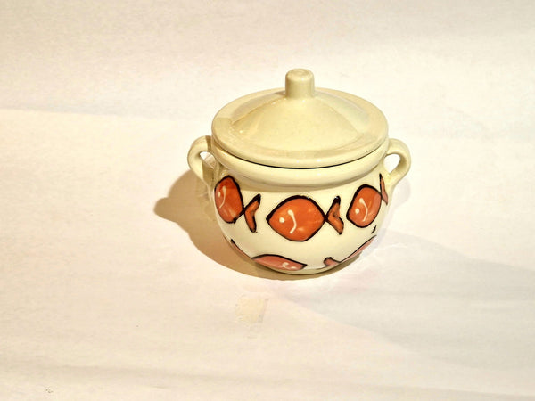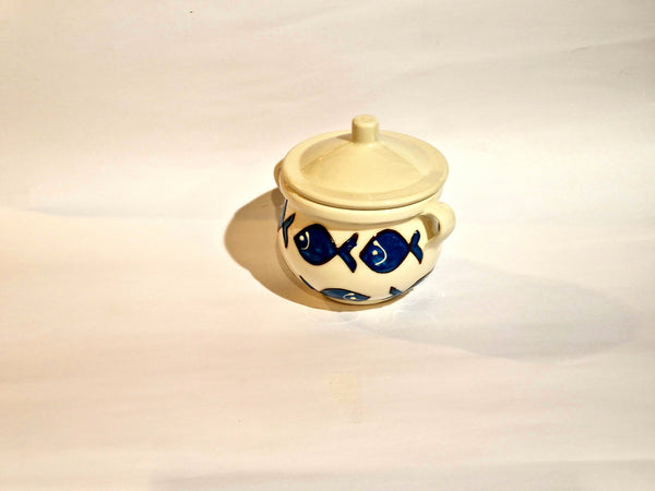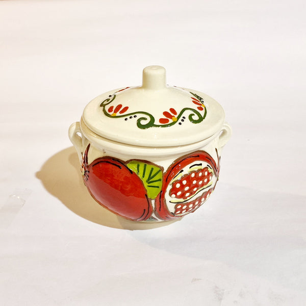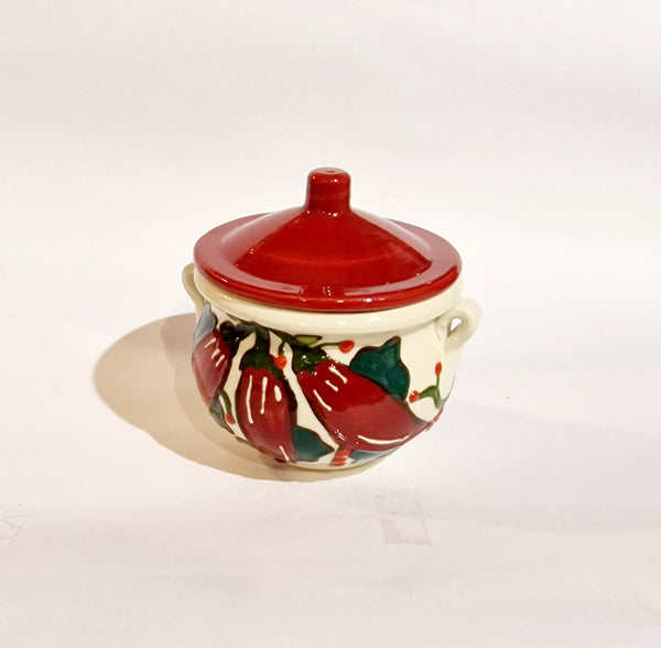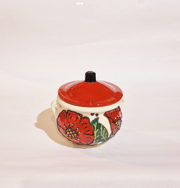 Barattolo per cucina in ceramica; decorata a mano con particolari rifiniture in rilievo; colori brillanti,unici e inconfondibili; da utilizzare come zuccheriera ,formaggiera ,saliera.....